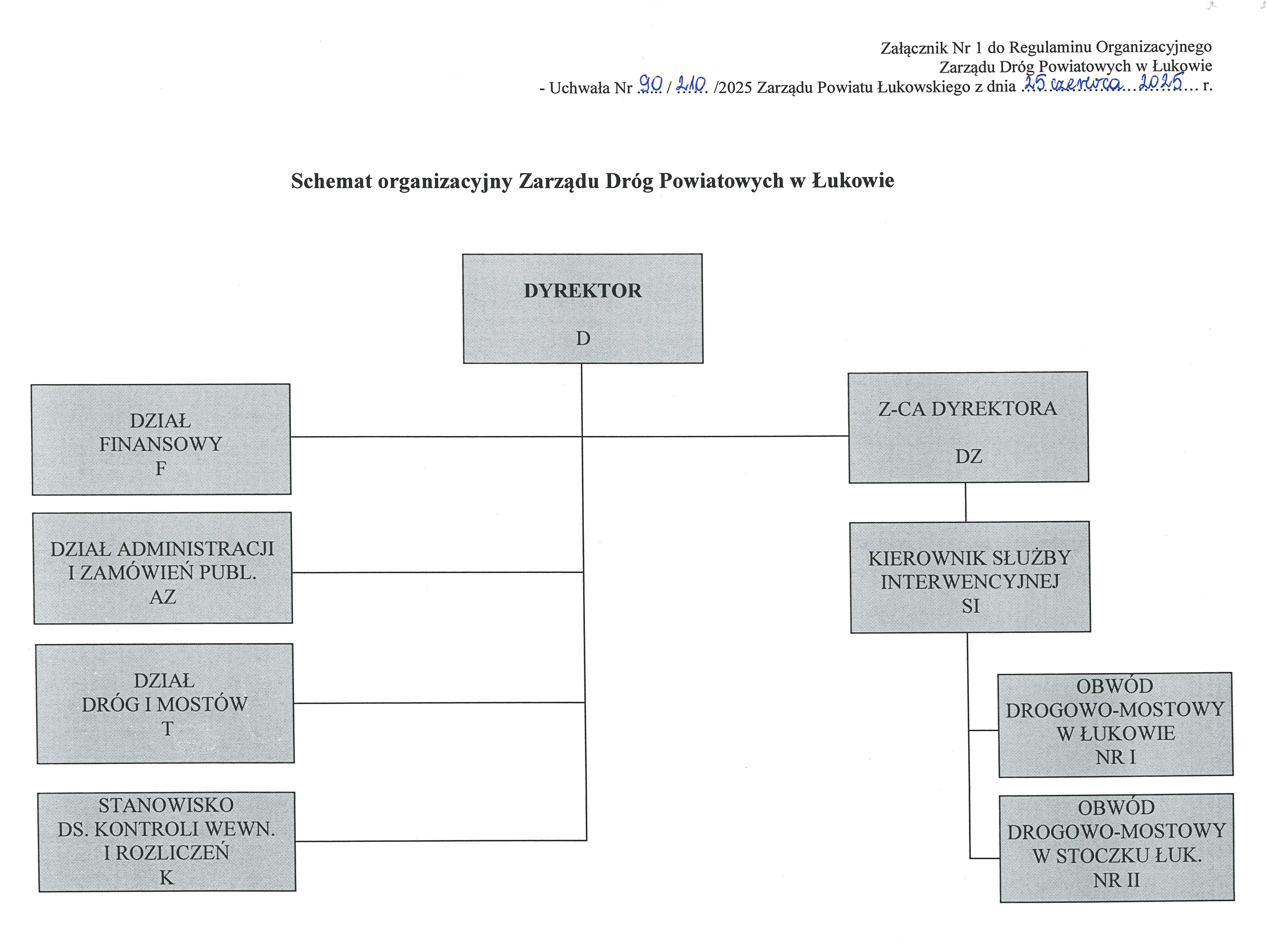 Zarząd Dróg Powiatowych w Łukowie działa według jasno określonej struktury organizacyjnej, która zapewnia sprawne i skuteczne wykonywanie powierzonych zadań. Każdy dział i komórka organizacyjna realizuje konkretne obowiązki, wspierając funkcjonowanie całej jednostki i przyczyniając się do utrzymania i rozwoju infrastruktury drogowej w powiecie łukowskim.